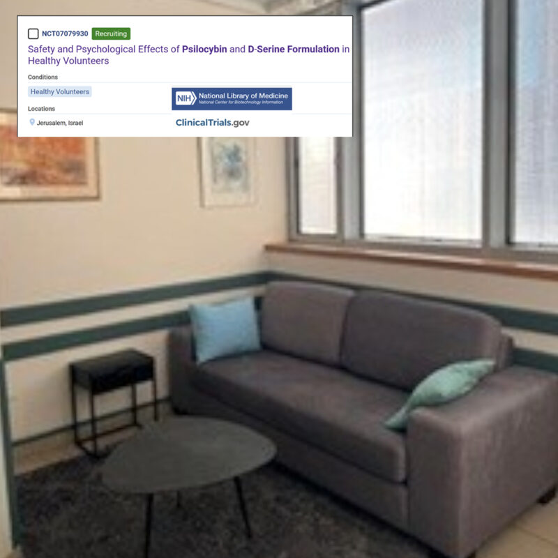 Hadassah BrainLabs Center for Psychedelic Research is proud to announce the inception of the first clinical trial emanating from our preclinical work. A Phase 1 Study is underway on the “Safety and Psychological Effects of Psilocybin and D-Serine Formulation in Healthy Volunteers.” The study brings to the clinic the hypothesis proposed by Prof. Uriel Heresco-Levy and Prof. Bernard Lerer and the preclinical proof of concept study of PhD students Tom Ben Tal and Ilana Pgodin, conducted in the Hadassah BrainLabs Center for Psychedelic Research. It is being conducted in a purpose-designed treatment suite in the Department of Internal Medicine at Hadassah Medical Center in collaboration with Dr. David (Dudu) Hakimian. Pictures show the treatment room and the listing of the protocol on ClinicalTrials.gov.